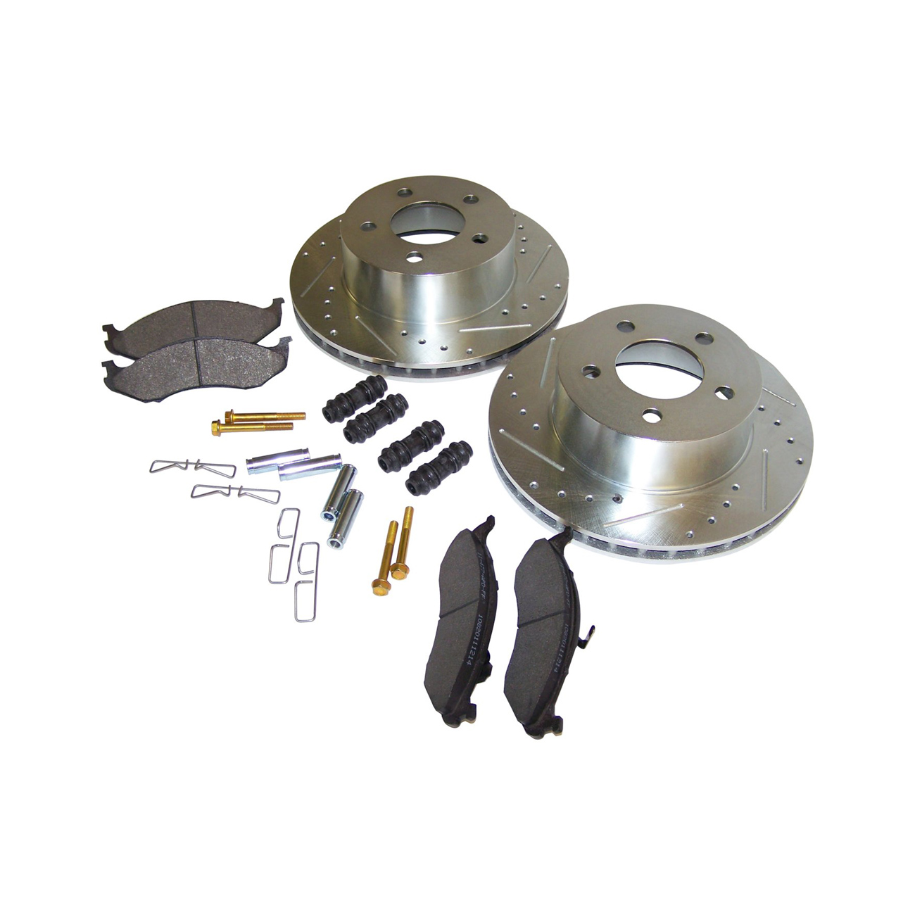 High Performance Front Cross Drilled and Slotted Rotor and Pad Set. Križno izvrtane luknje in obdelani utori zagotavljajo maksimalno hlajenje zavornih ploščic in rotorja, kar pomaga odpraviti pojemanje zavor. Boljše odvajanje toplote zmanjšuje verjetnost deformacije rotorja. They are designed to rapidly expel friction gases.